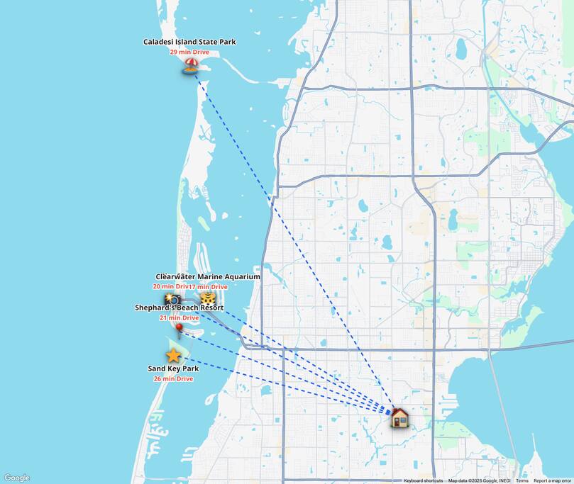 Central Clearwater location — 15 min to the beach, 30 min to Tampa or St. Pete. Car recommended.
